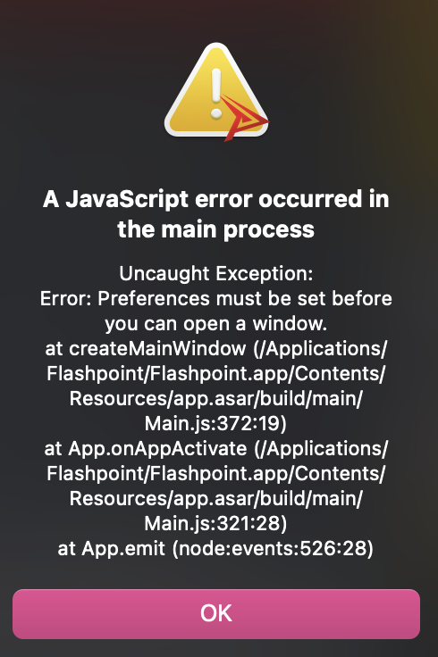 10:19, 21 August 2022Thumbnail for version as of 10:19, 21 August 2022490 × 736 (144 KB)Nosamu (talk | contribs)Shows an error popup that may appear when the Launcher starts on MacOS. The error reads: "A JavaScript error occurred in the main process: Uncaught exception: Error: Preferences must be set before you can open a window."